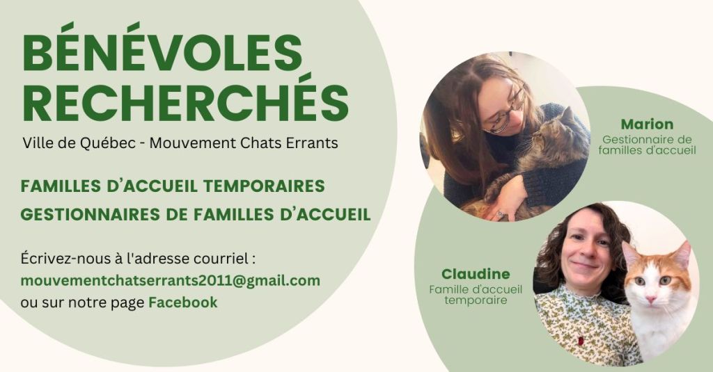 Mouvement Chats errants a été créé en août 2011 dans le but de venir en aide aux chats errants de la Ville de Québec et ultimement, de travailler pour le mieux-être des chats de Québec. Nous sommes un organisme à but non lucratif enregistré, entièrement composé de bénévoles.