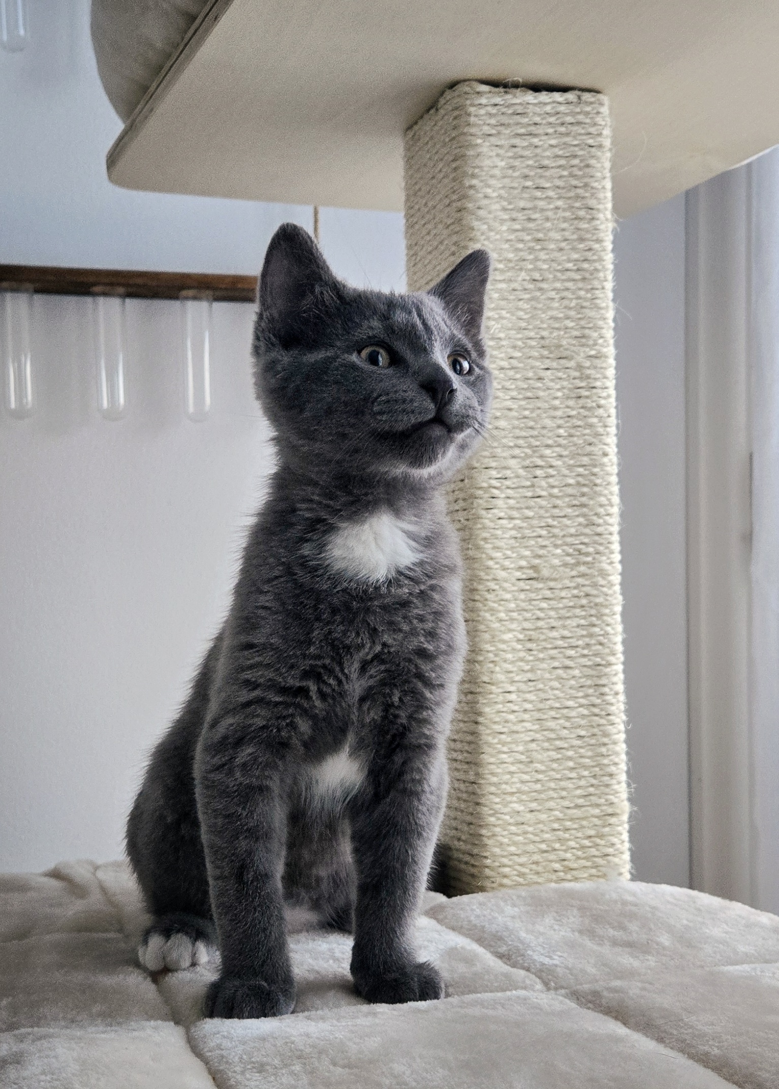 C’est un chaton très actif qui a besoin de bouger. Il passe une bonne partie de sa journée à courir d’une pièce à l’autre et cherche naturellement la hauteur. Il explore son environnement en grimpant partout où il le peut.
